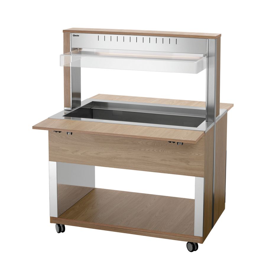 Die mobile Buffetlösung im modernen Holzdesign - Der Buffetwagen mit Hustenschutz und LED-Beleuchtung fasst 3 GN-Behälter 1/1 GN und hält mit dem Wasserbad-Prinzip Speisen schonend und ansprechend am Buffet warm.