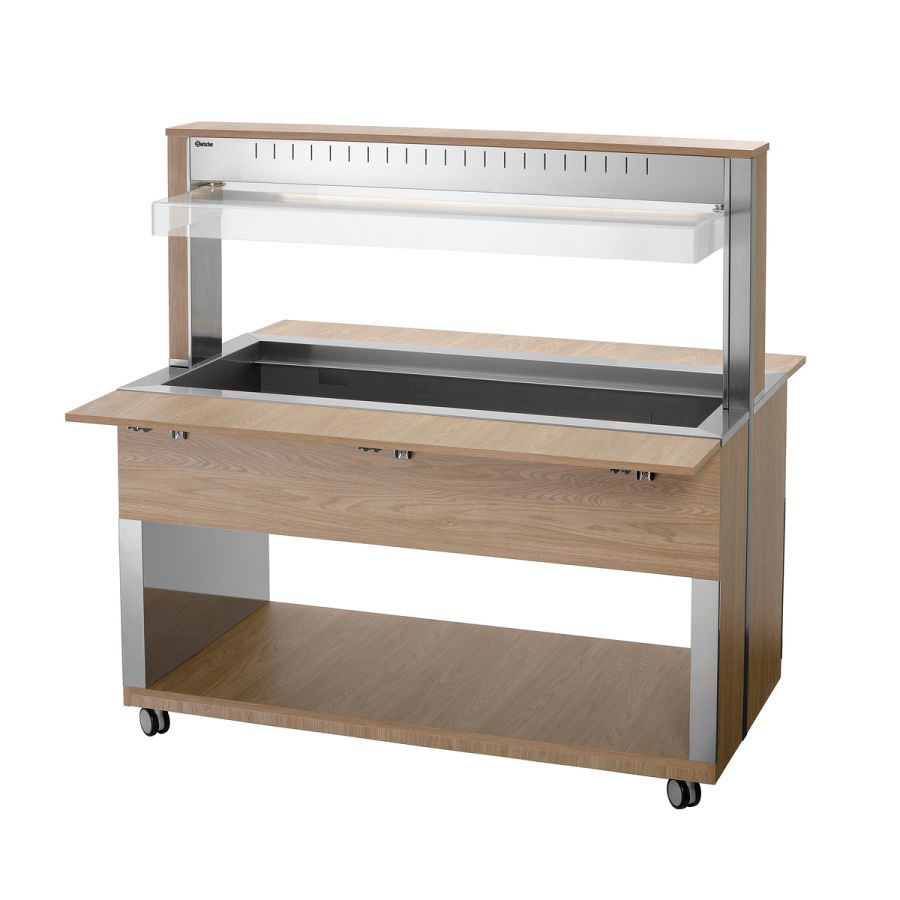 Die mobile Buffetlösung im modernen Holzdesign - Der Buffetwagen mit Hustenschutz und LED-Beleuchtung fasst 4 GN-Behälter 1/1 GN und hält mit dem Wasserbad-Prinzip Speisen schonend und ansprechend am Buffet warm.