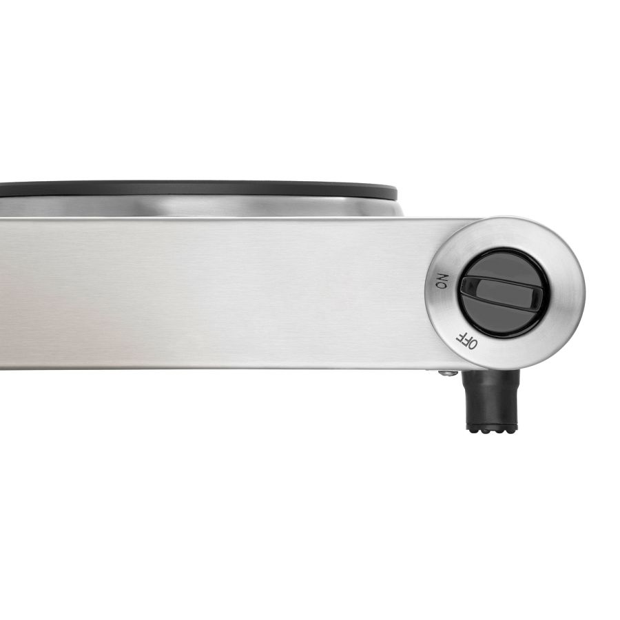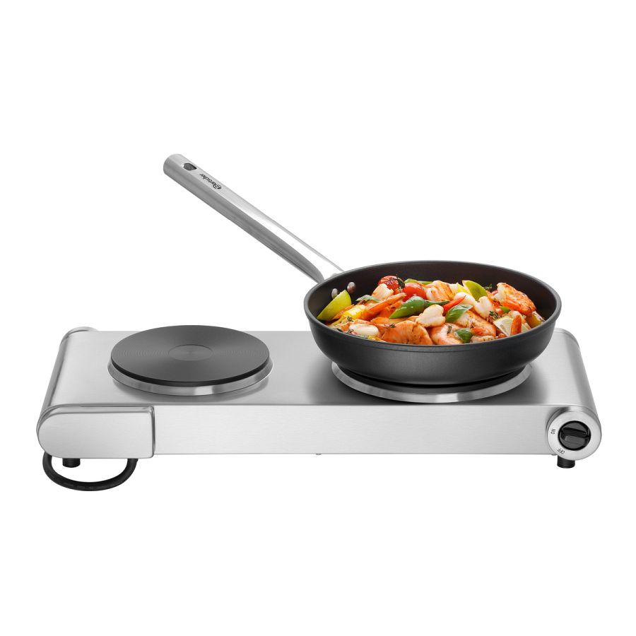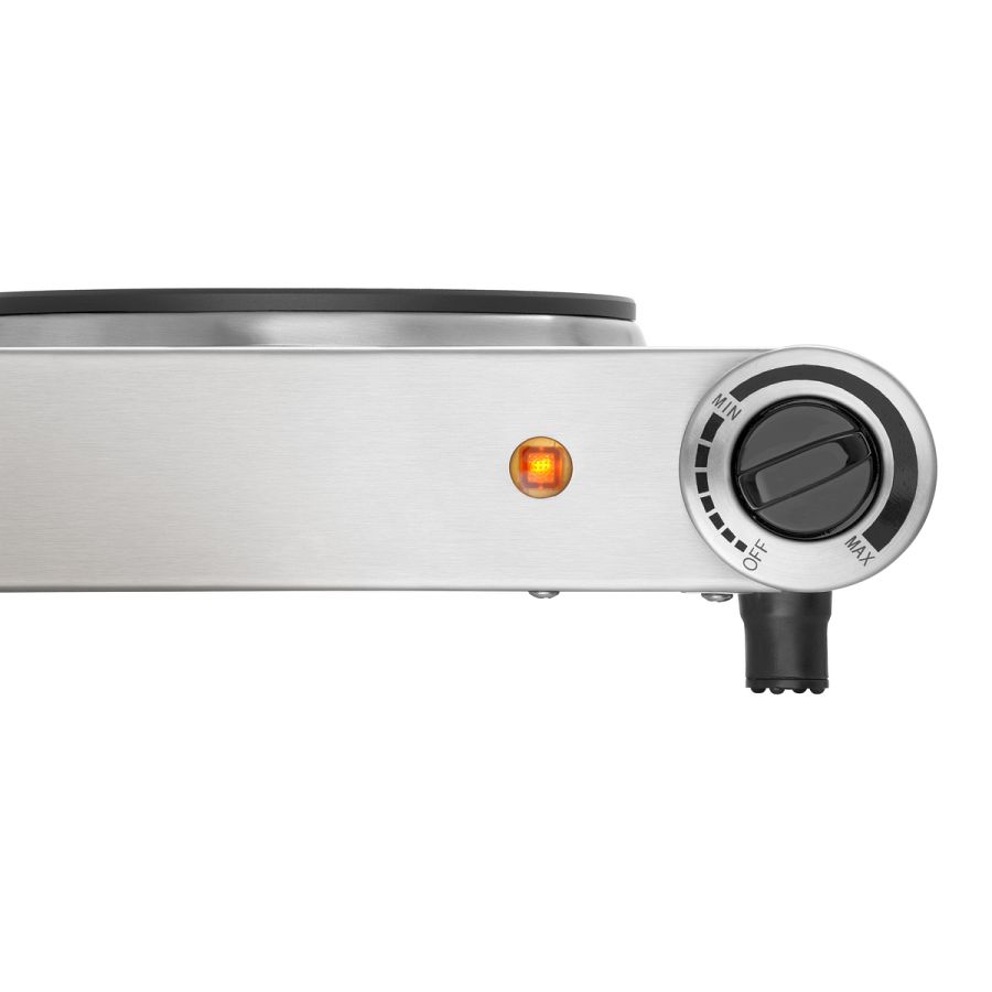 Der intuitiv bedienbare Elektro-Kocher verfügt über zwei nebeneinander liegenden Kochstellen. Mit den beiden Drehreglern kann hier die jeweilige Temperatur stufenlos eingestellt werden.