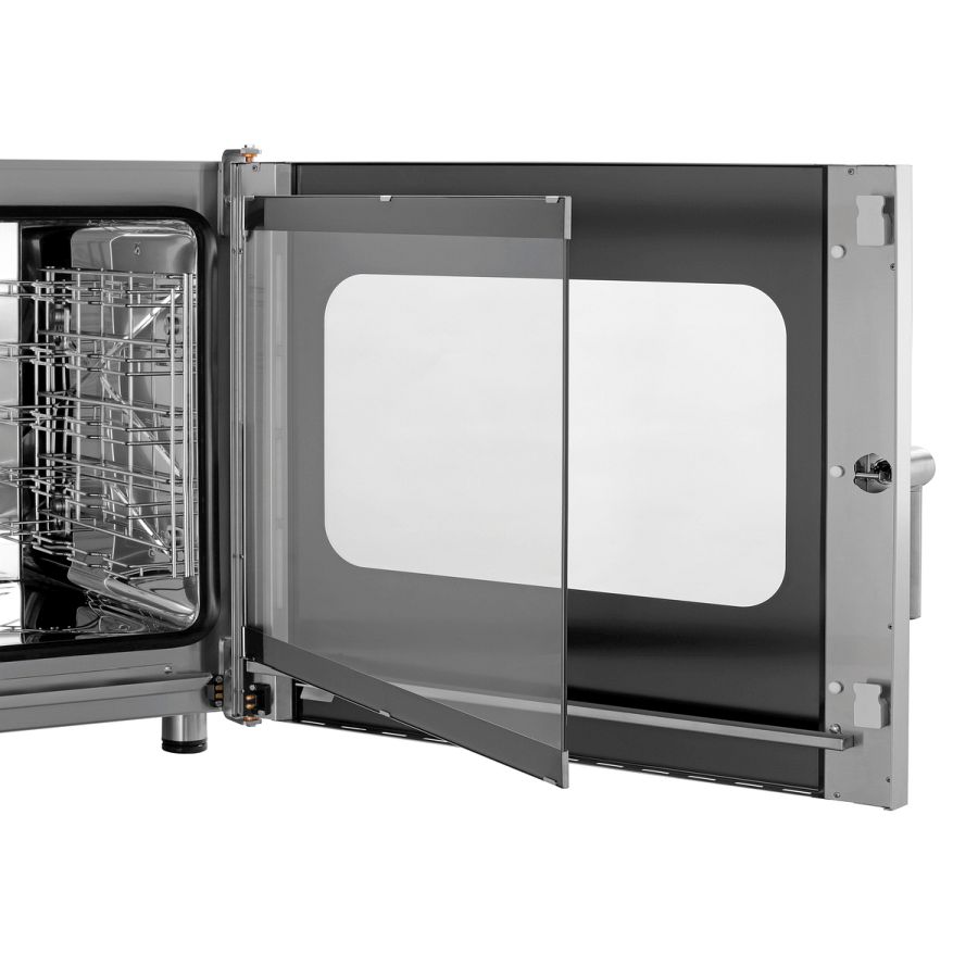- Funktionen: Dampferzeugung durch Direkteinspritzung, Dämpfen, Kombidämpfen, Niedertemperaturgaren, Reversierender Motorlauf (Lüfterräder), Umluft