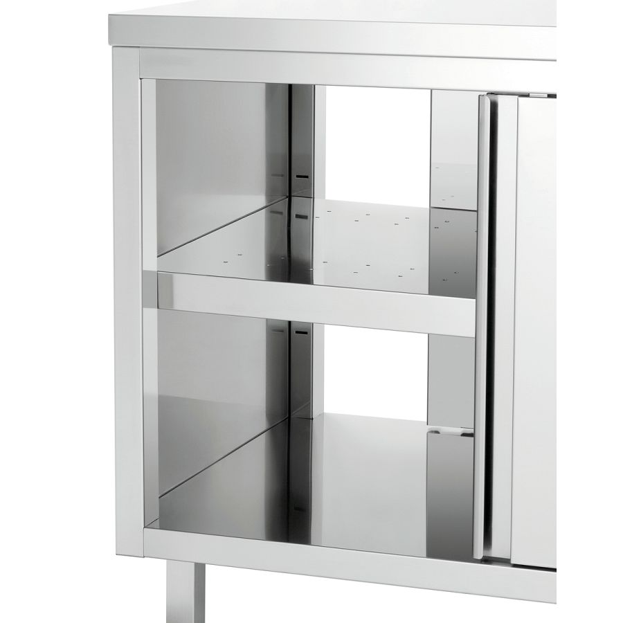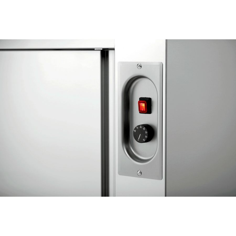 Der Wärmeschrank mit einer Breite von 1,8 Metern bietet einen stufenlos regulierbaren, beheizten Stauraum mit beidseitiger Bedienung. Mit der robusten Oberfläche aus Edelstahl integriert sich gleichzeitig ein solides Arbeitselement in die Küche.
