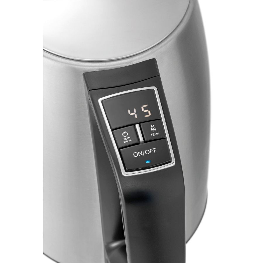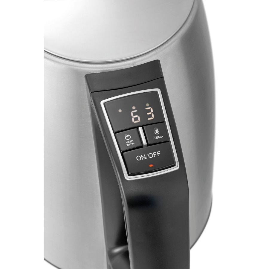 Der einfach zu bedienende Wasserkocher mit Display und 14 Temperaturstufen hält Wasser bis zu einer Stunde auf Temperatur. Dank vieler Ausstattungsmerkmale, wie dem herausnehmbaren Kalkfilter und der Kochstopp-Automatik, ist er ein zuverlässiger Partner in jeder Küche.