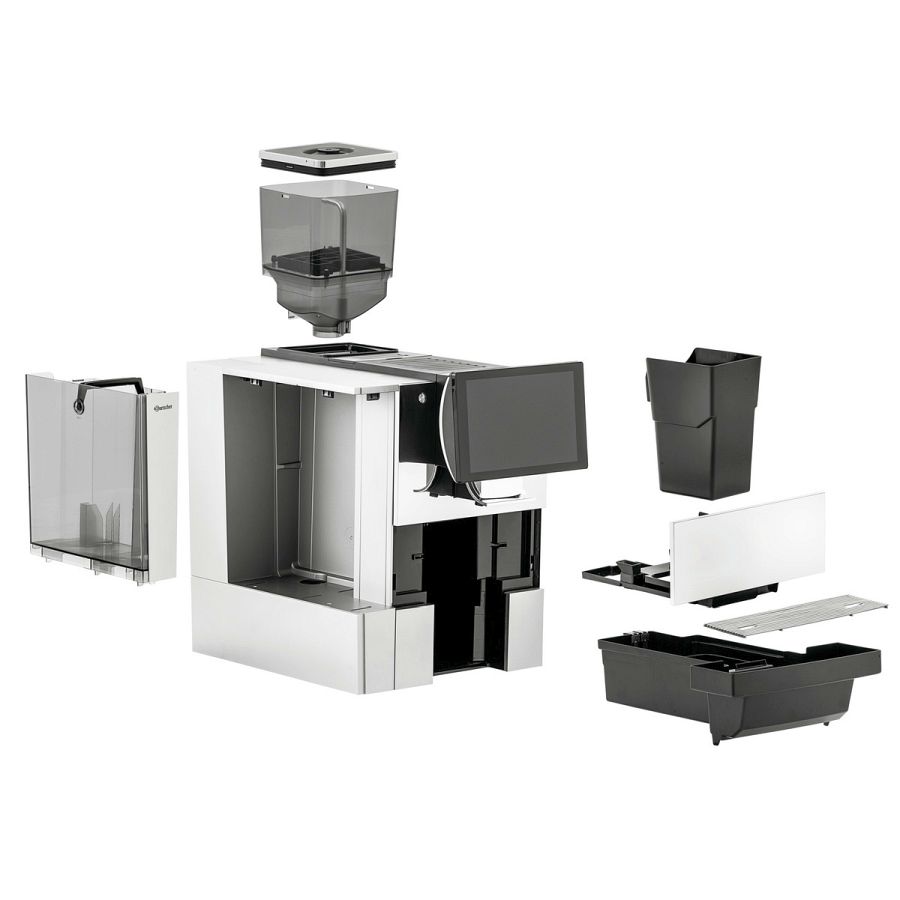 - Eigenschaften: Bohnenbehälter werkzeuglos herausnehmbar , Bodenplatte mit Ausschnitt für einen automatischen Trester-Auswurf , Gleichzeitige Ausgabe von Kaffee und Wasser möglich (Americano), Leistungsstarke Heizung: 2 x 1.400 W, Wassertank mit Griff
