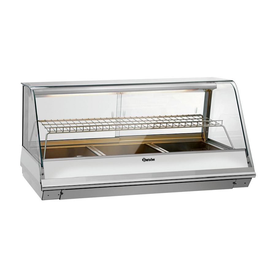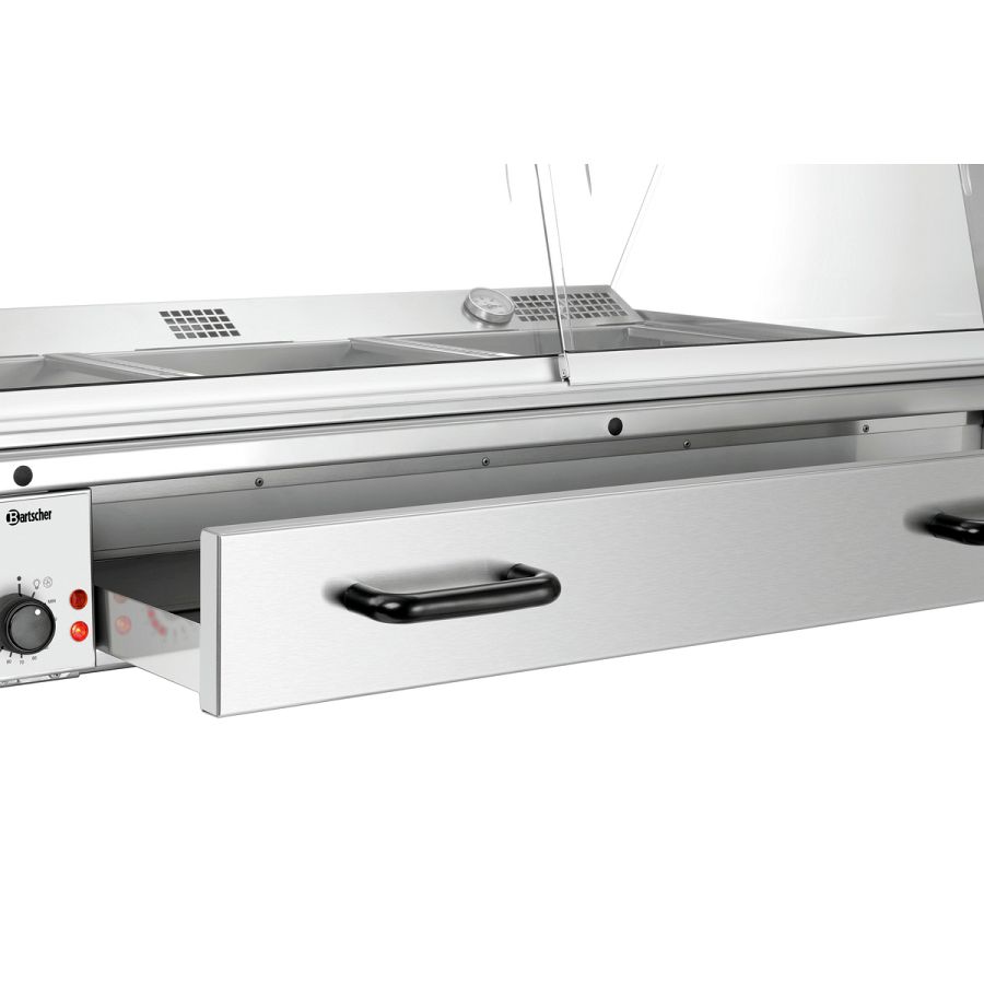 Zubereitete Speisen werden dank der hochwertigen Ausführung und Innenbeleuchtung bei der Speisenausgabe perfekt in Szene gesetzt. Die individuelle Bestückung von bis zu 3 x 1/1 GN und die Zwischenablage bieten bedarfsgerechte Nutzungsmöglichkeiten der heißen Theke. Für eine einfache Reinigung sorgen die abklappbare Frontscheibe und die herausnehmbare Abtropfschublade.
