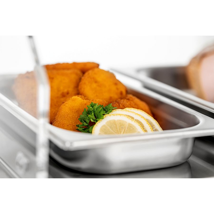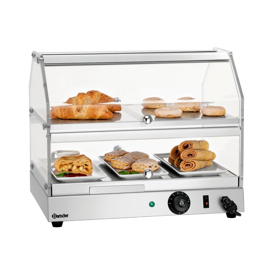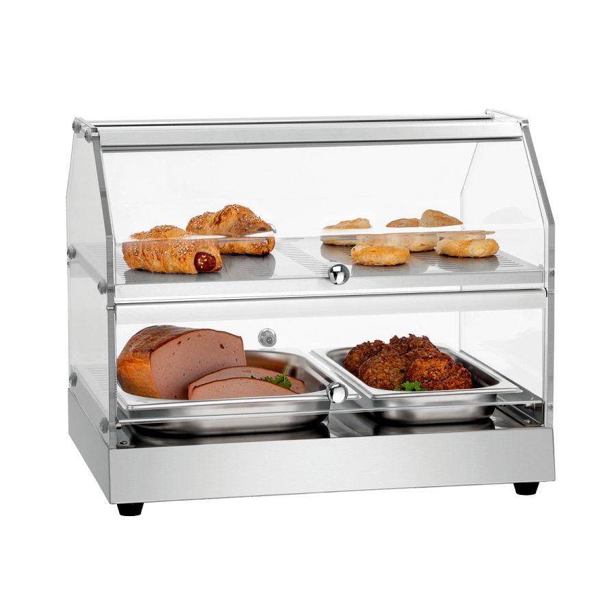 Warmhaltevitrine mit zwei Ebenen für perfekt präsentierte Gaumenfreuden. Dank der warmen, feuchten Luft sind die Speisen auch nach einer Aufbewahrung von mehreren Stunden noch warm und saftig - wie frisch aus dem Ofen. Zwei Klapptüren an Vorder- sowie Rückseite ermöglichen ein einfaches Entnehmen und Bestücken von beiden Seiten.