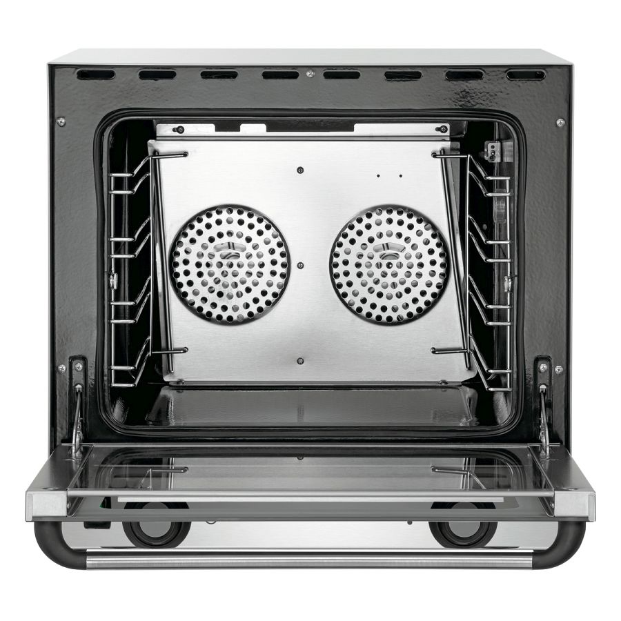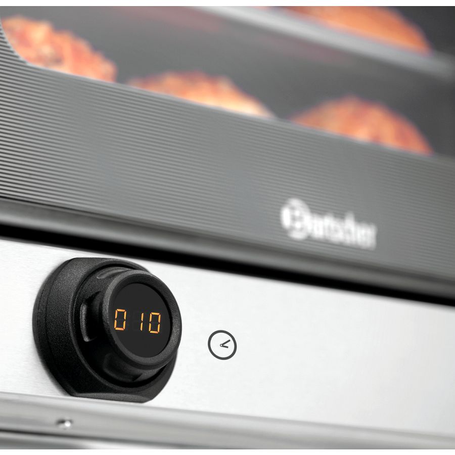 - Eigenschaften: Abgerundete Backkammer, Auflageschienen herausnehmbar, Doppeltürverglasung, Knebel mit Digital-Anzeige für Temperatur und Zeit, Memory-Funktion, Mögliche Pausierung des Garprozesses über Temperaturregler, Signalton nach Ablauf der Zeit (1 - 120 Minuten)