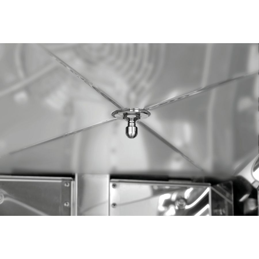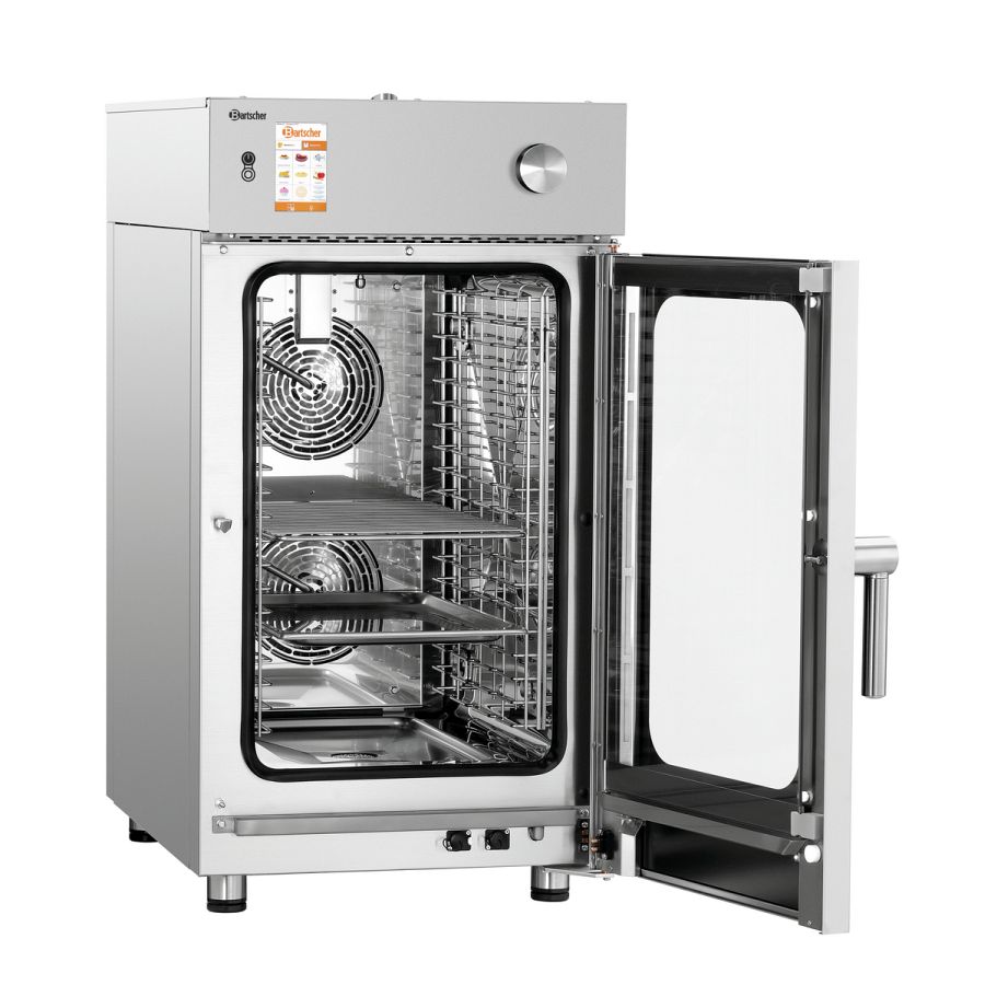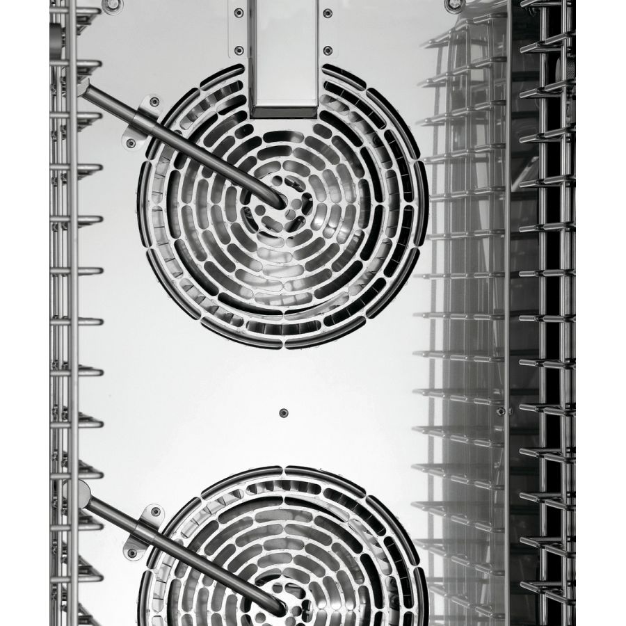 - Funktionen: Umluft, Dämpfen, Kombidämpfen, Niedertemperaturgaren, Delta-T-Garen, Reversierender Motorlauf (Lüfterräder), Dampferzeugung durch Direkteinspritzung, Cooldown in Garphase