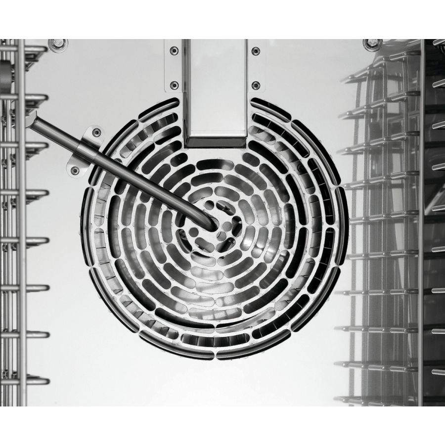 - Funktionen: Umluft, Dämpfen, Kombidämpfen, Niedertemperaturgaren, Delta-T-Garen, Reversierender Motorlauf (Lüfterräder), Dampferzeugung durch Direkteinspritzung, Cooldown in Garphase