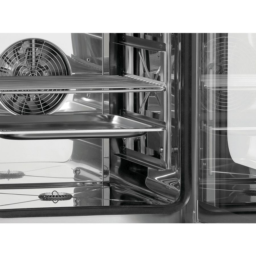 - Funktionen: Dampferzeugung durch Direkteinspritzung, Dämpfen, Kombidämpfen, Niedertemperaturgaren, Reversierender Motorlauf (Lüfterräder), Umluft