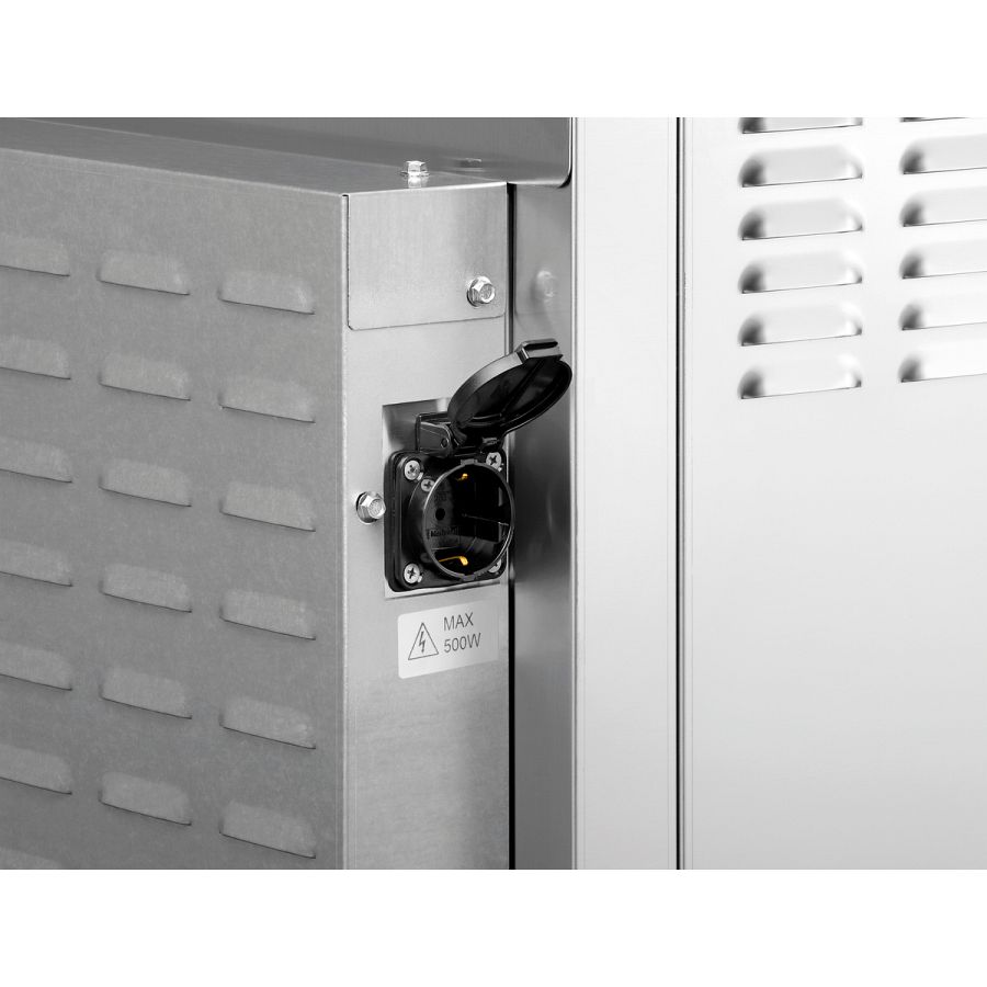 • Eigenschaften: Abgerundeter Garraum, Auflageschienen herausnehmbar, Doppeltürverglasung, LED-Beleuchtung in der Tür, Steckdose (500 W) für den Anschluss einer Dunstabzugshaube