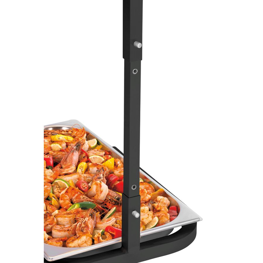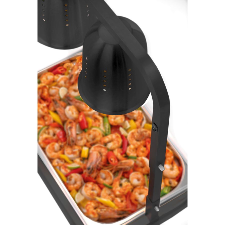 Modernes Design in Schwarz trifft auf Funktionalität: Die eleganten Wärmelampen setzen nicht nur optische Akzente - ihre leistungsstarken und belüfteten Aluminiumreflektoren sorgen für eine konstante Wärmeabgabe. So bleiben Speisen in Behältern bis zu einer Größe von 1/1 GN zuverlässig temperiert - ob am Buffet, bei Caterings oder beim Einsatz in der Gemeinschaftsverpflegung.