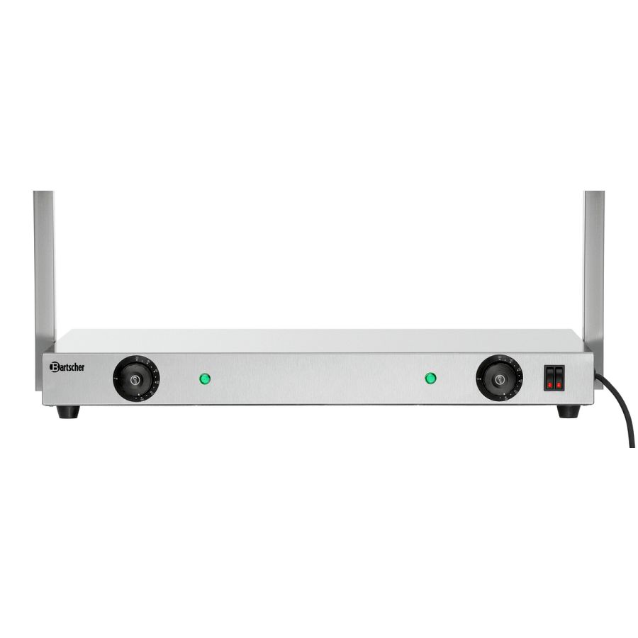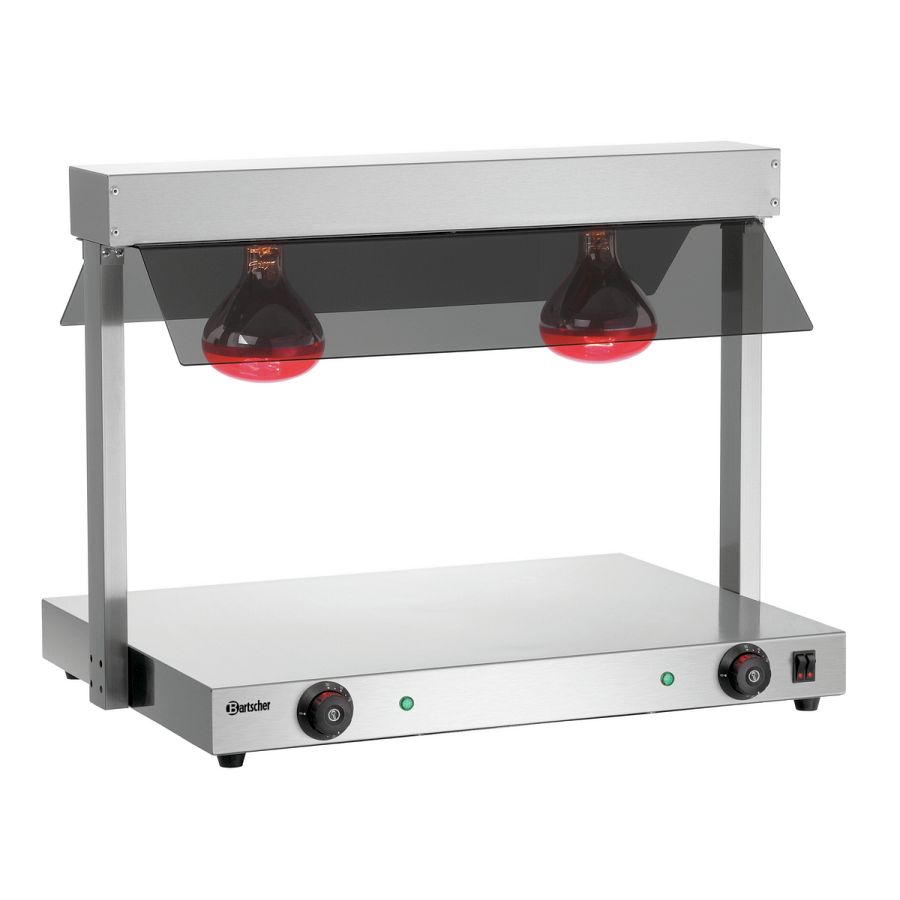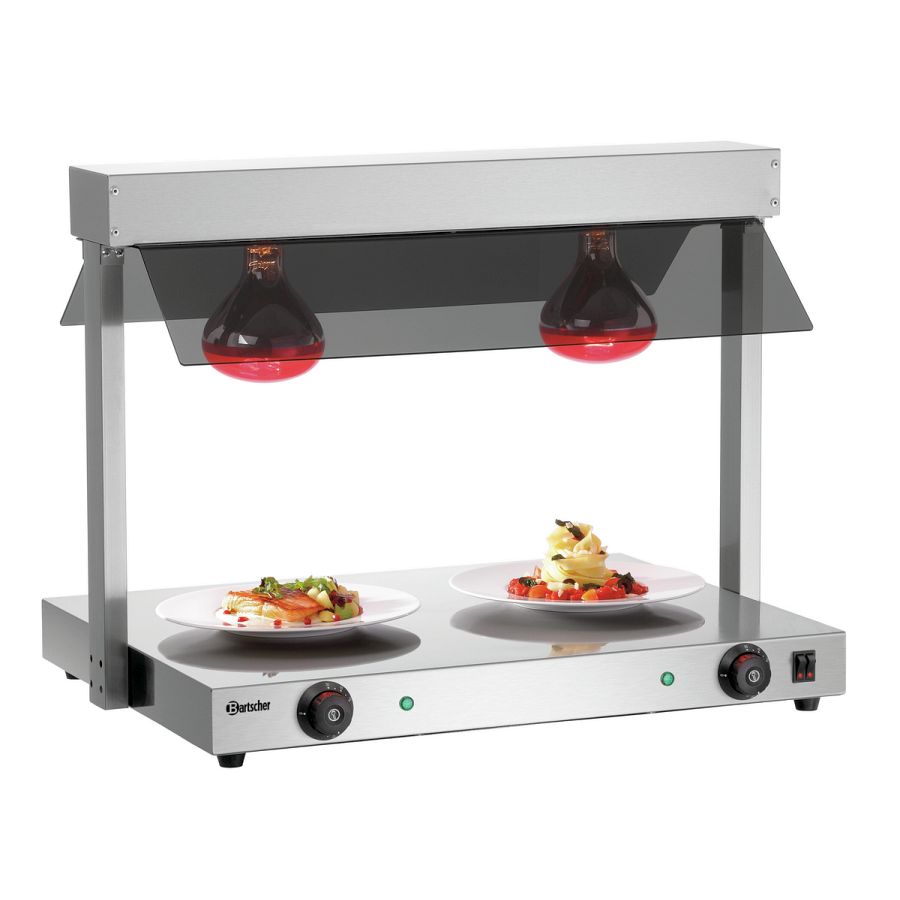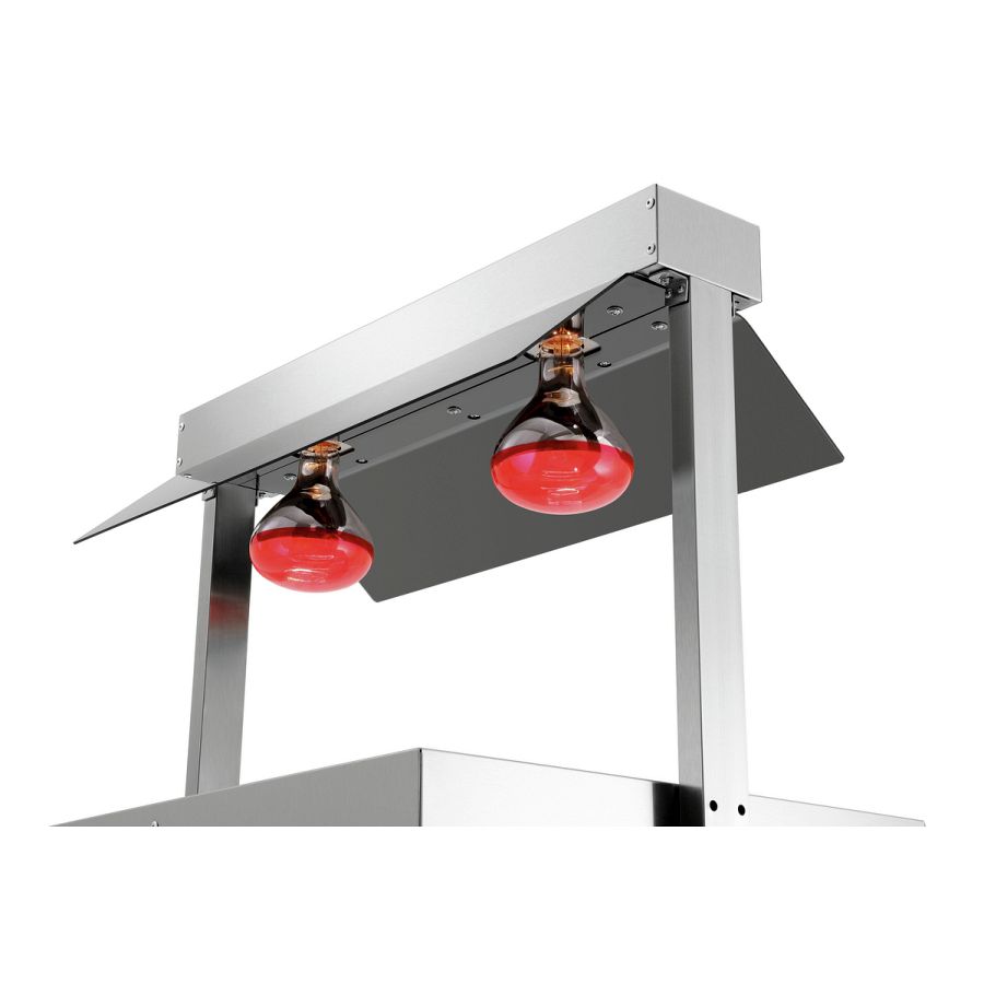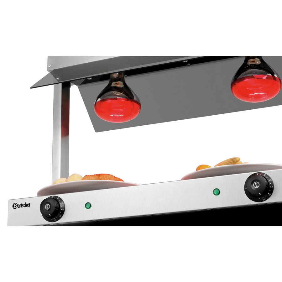 Für GN-Behälter am Buffet oder für Teller an der Speisenausgabe - Mit der Wärmebrücke bleiben Speisen stets perfekt temperiert. Denn die Wärme wird von oben über 2 Infrarot-Wärmelampen und von unten über die Edelstahl-Warmhalteplatte an die Speisen abgegeben.