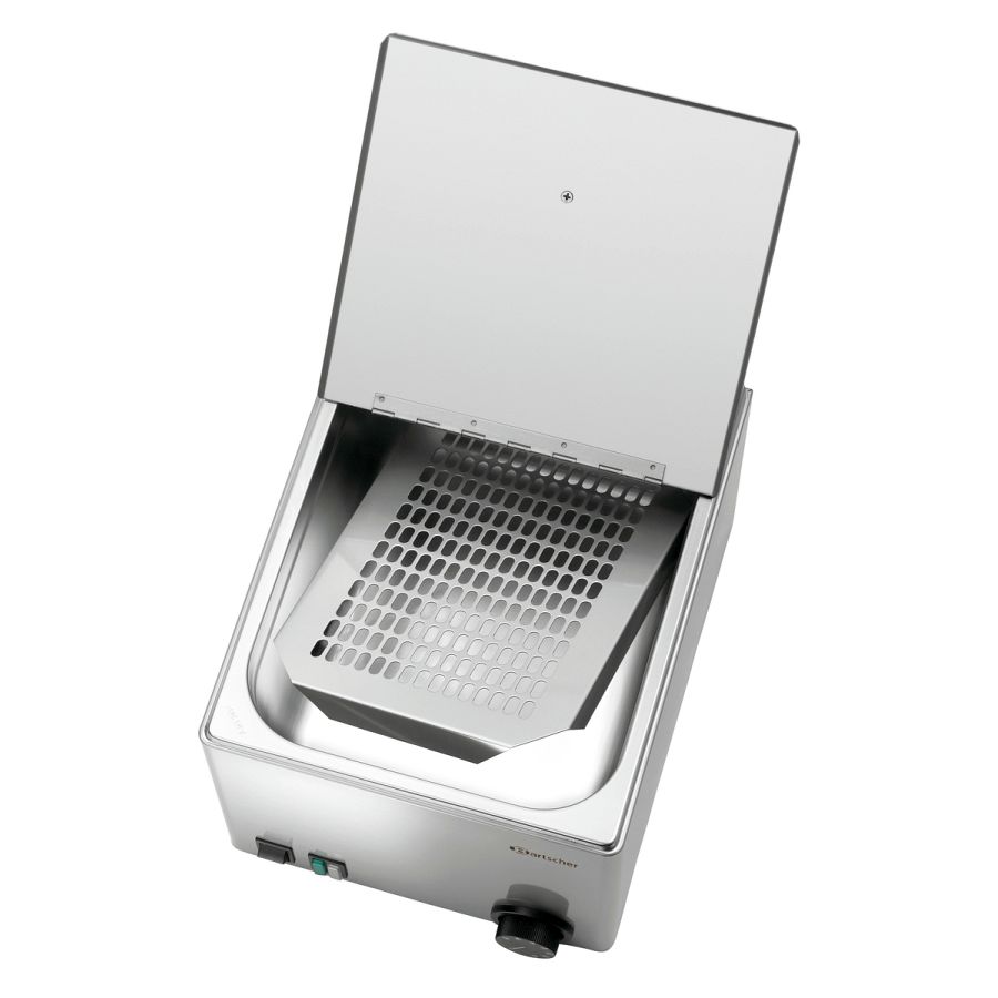 Dank des Ablagerosts werden die Würstchen im Dampfbad schonend warmgehalten. Für ein einfaches Handling sorgt der fest montierte klappbare Deckel.