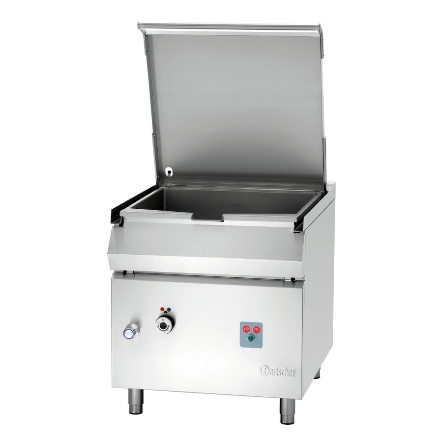 Kippbratpfanne der Serie 900 in bekannter hochwertiger Edelstahl-Ausführung. Der Tiegel ist vollständig aus Edelstahl und fasst bis zu 70 Liter. Das Elektro-Modell mit elektromotorischer Kippvorrichtung verfügt über einen Wassereinlaufhahn und ist ausgelegt für einen Kalt- oder Warmwasseranschluss.