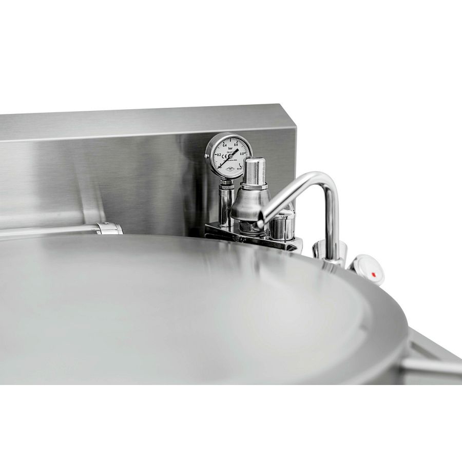 - Eigenschaften: Automatische Wasserstandskontrolle im Zwischenmantel, Bei Störung automatische Abschaltung, Drucküberwachung: Trichterarmaturen mit Sicherheitsventil (auf 0,5 bar kalibriert), Elektrobeheizung durch gussgekapselte "Incoloy 800" Widerstände aus Speziallegierung, Mischbatterie für Kalt- und Warmwasser, Inklusive: Ablaufsieb