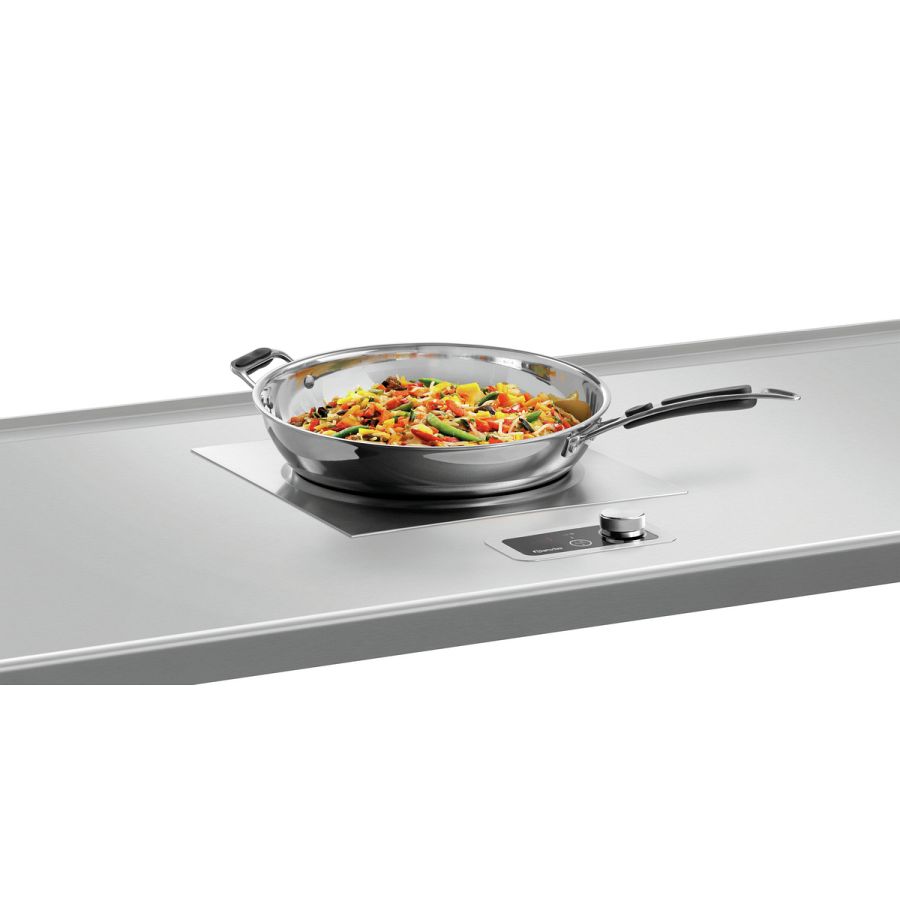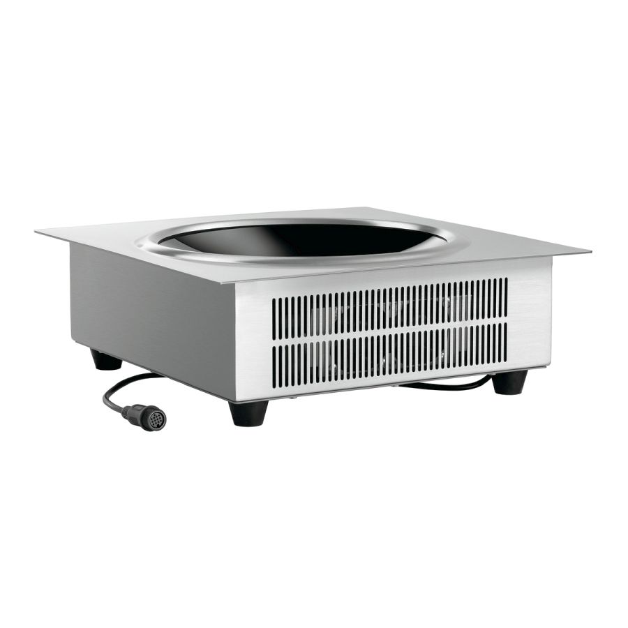 Der Einbau-Induktionswok lässt sich in Tisch- und Arbeitsplatten integrieren und bietet damit eine optimale Arbeitshöhe. Das separate Bedienfeld ermöglicht eine stufenlose Reglung von 60 bis 240 °C. Alternativ stehen 10 Leistungsstufen zur Wahl.