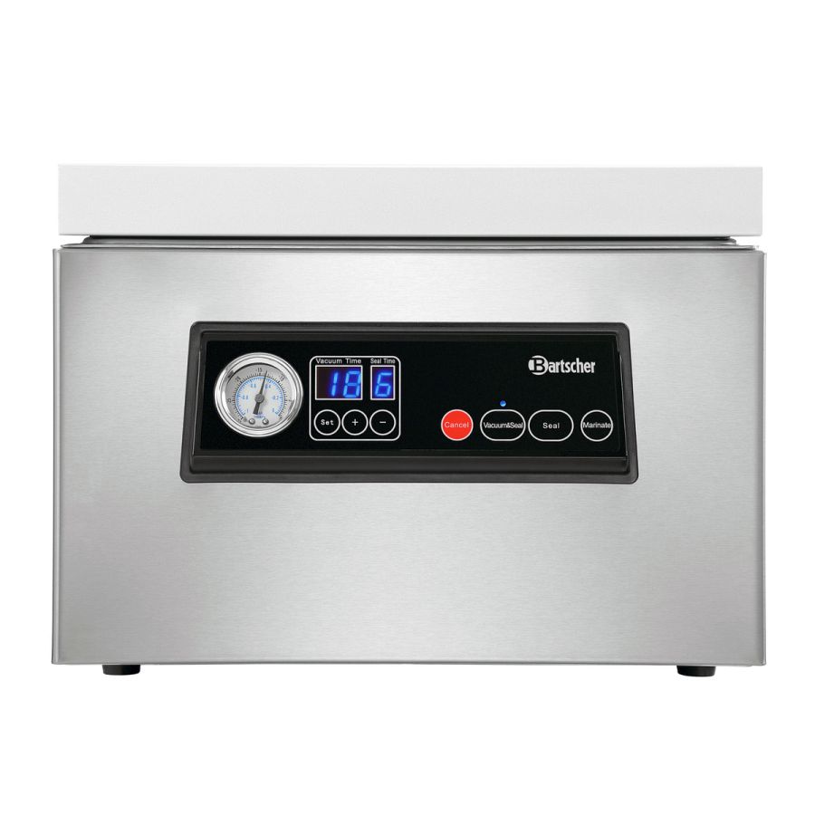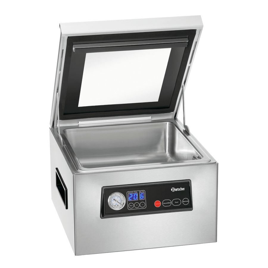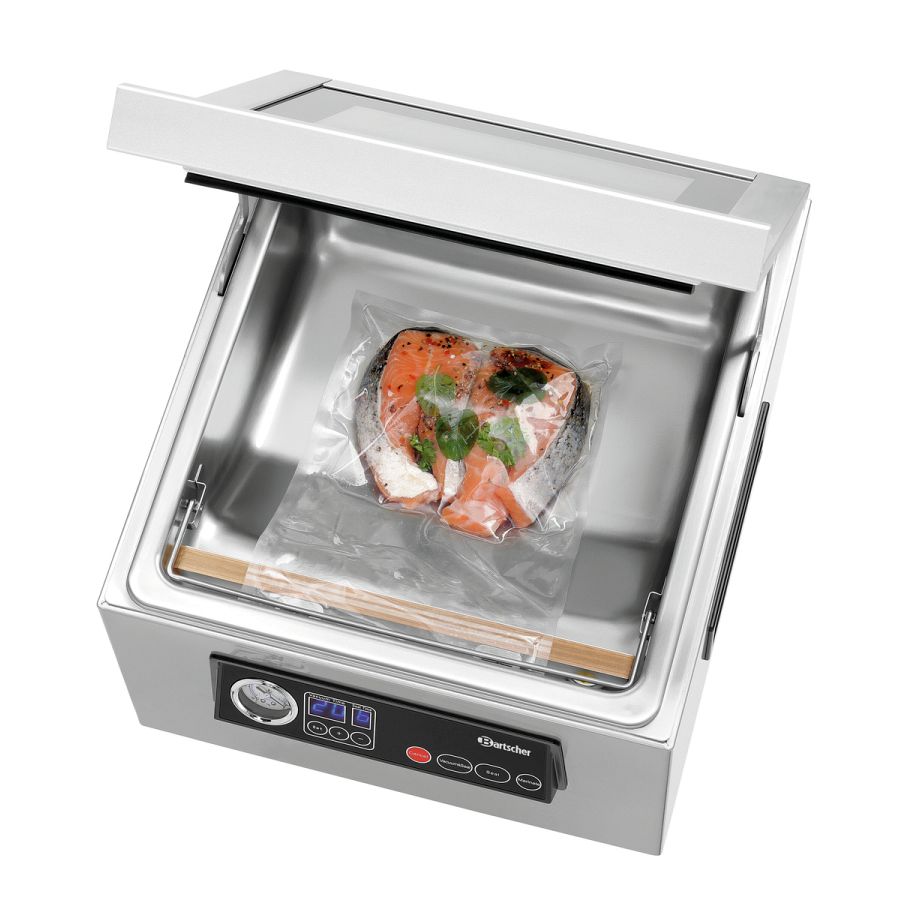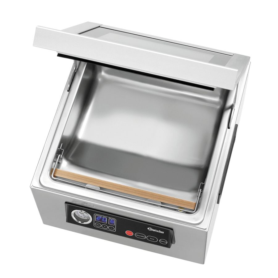 Alles im Blick: Das Kammer-Vakuumiergerät ist mit einem Glasdeckel und einem Manometer zur Überwachung des Unterdrucks ausgestattet. Ein Klemmbügel in der Kammer verhindert ein Verrutschen der Vakuumierbeutel.
