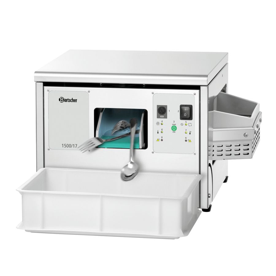 Besteck auf Hochglanz poliert - Bis zu 1.500 Besteckteile pro Stunde. Dank der integrierten UV-Lampe und der HACCP-konformen Betriebstemperatur sind die Besteckteile hygienisch frisch desinfiziert.