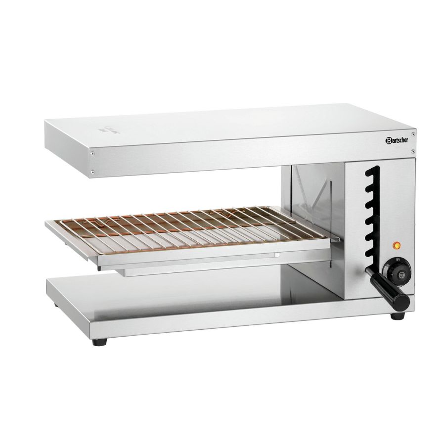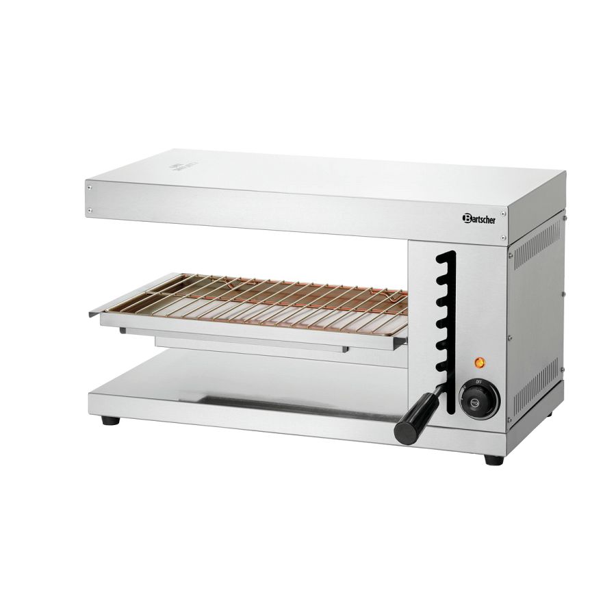 Gratinieren, überbacken und warmhalten direkt am Pass für einen fließenden Arbeitsablauf. Bei einer Platzierung auf einem Arbeitstisch bieten die beiden langen offenen Seiten des Salamanders eine praktische beidseitige Bedienung innerhalb der Küche oder zum Servicebereich.