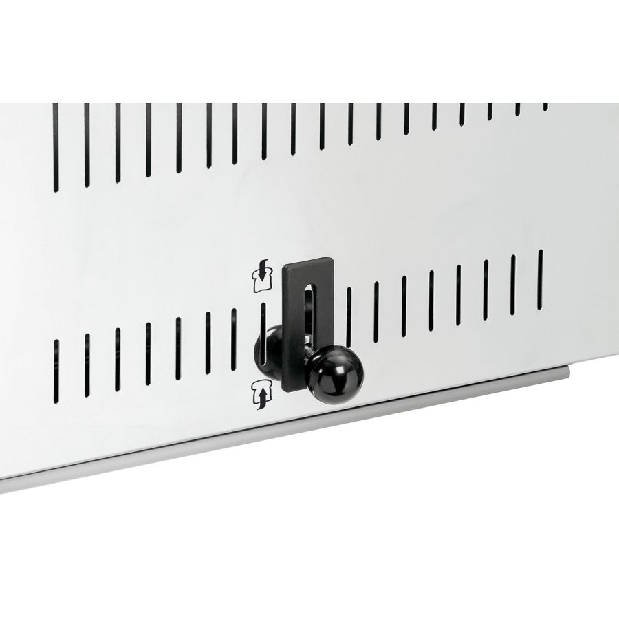 - Bedienung: 1 Bedienhebel für 6 Schlitze (manueller Auswurf), Wahlschalter für die Inbetriebnahme der Toastschlitze, 2er-Gruppen