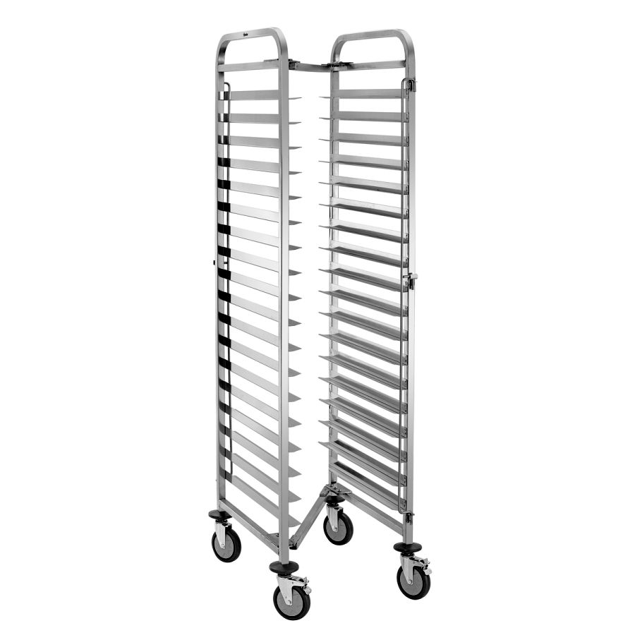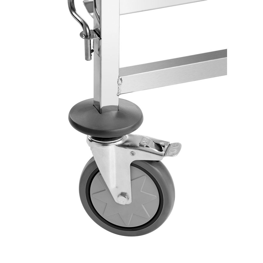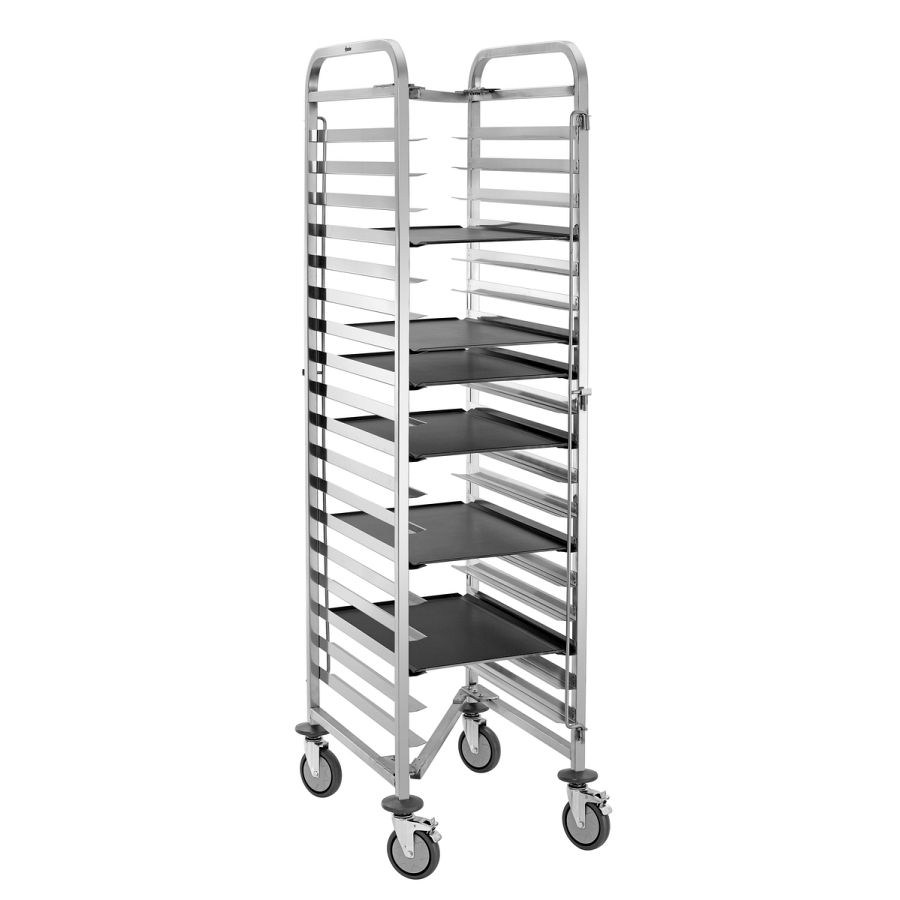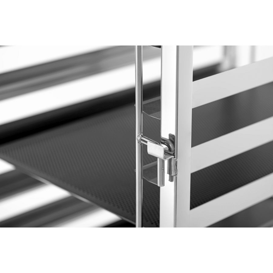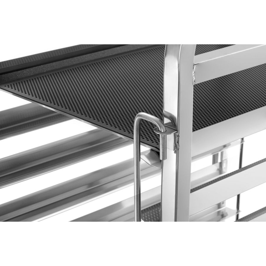 Perfekt für den professionellen Einsatz: Der Regalwagen fasst bis zu 18 Bäckereinorm-Bleche im Format 600 x 400 mm und sorgt für strukturierte Arbeitsabläufe. Die beidseitige Behältersicherung ermöglicht dabei ein schnelles und sicheres transportieren - selbst bei hoher Taktung.