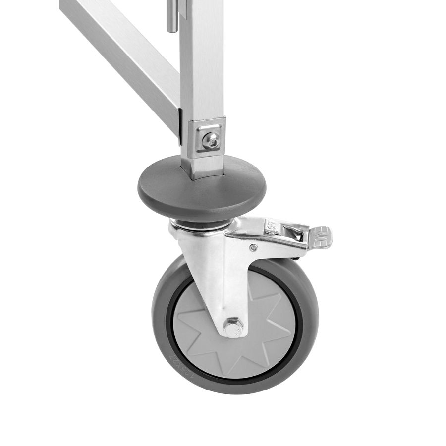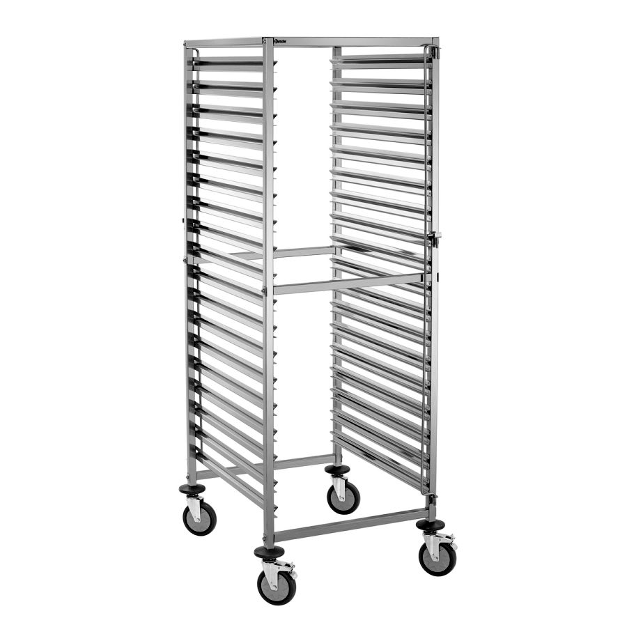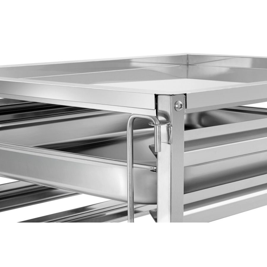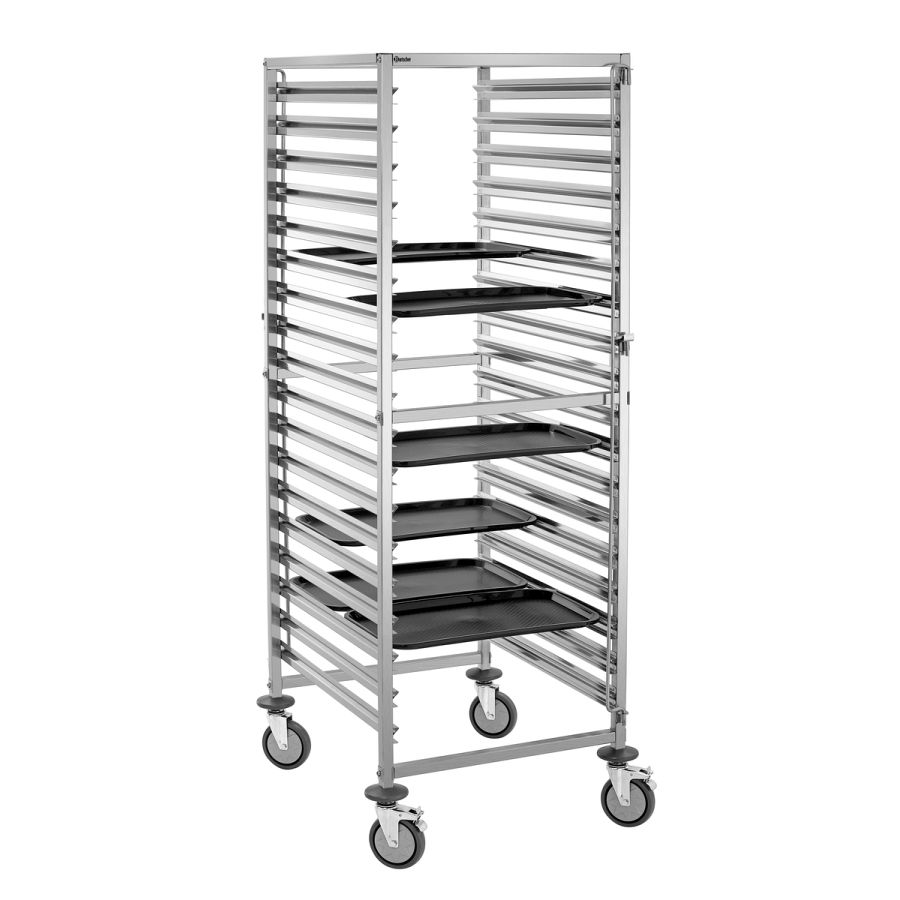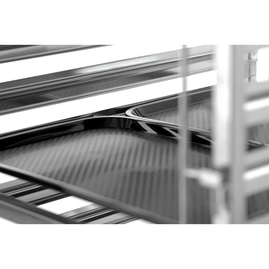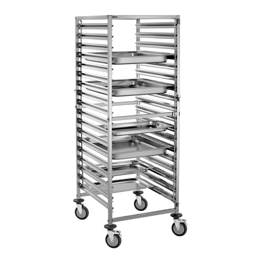 Leicht manövrierbar und durchdacht im Detail: Der Transport mit 18 Einschüben für GN-Behälter, Roste und Bleche bis 2/1 GN gelingt mühelos. Die beidseitige Behältersicherung verhindert zuverlässig das Verrutschen der Behälter und sorgt für sicheren Halt beim Transport.
