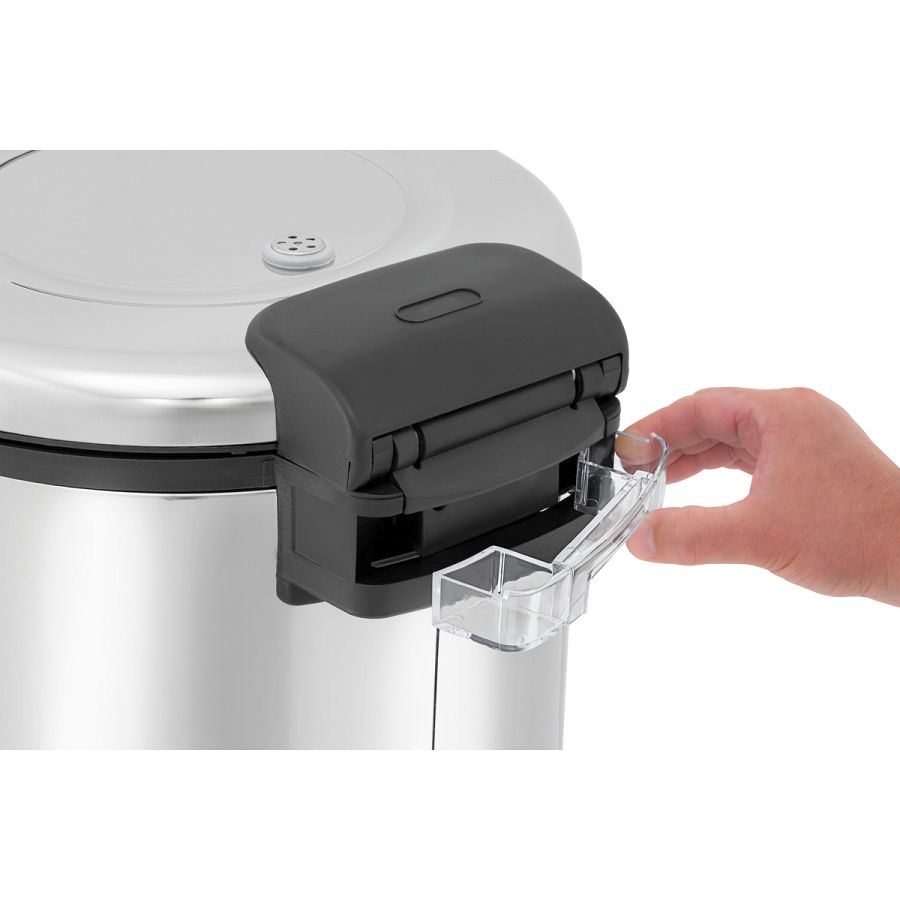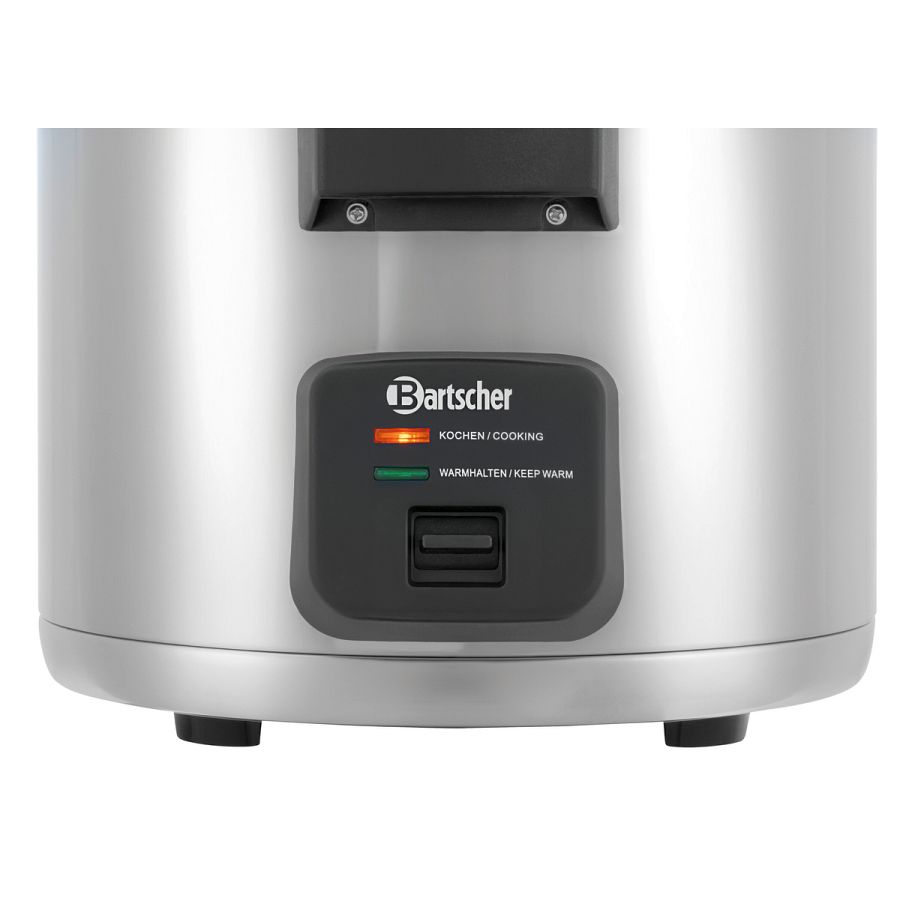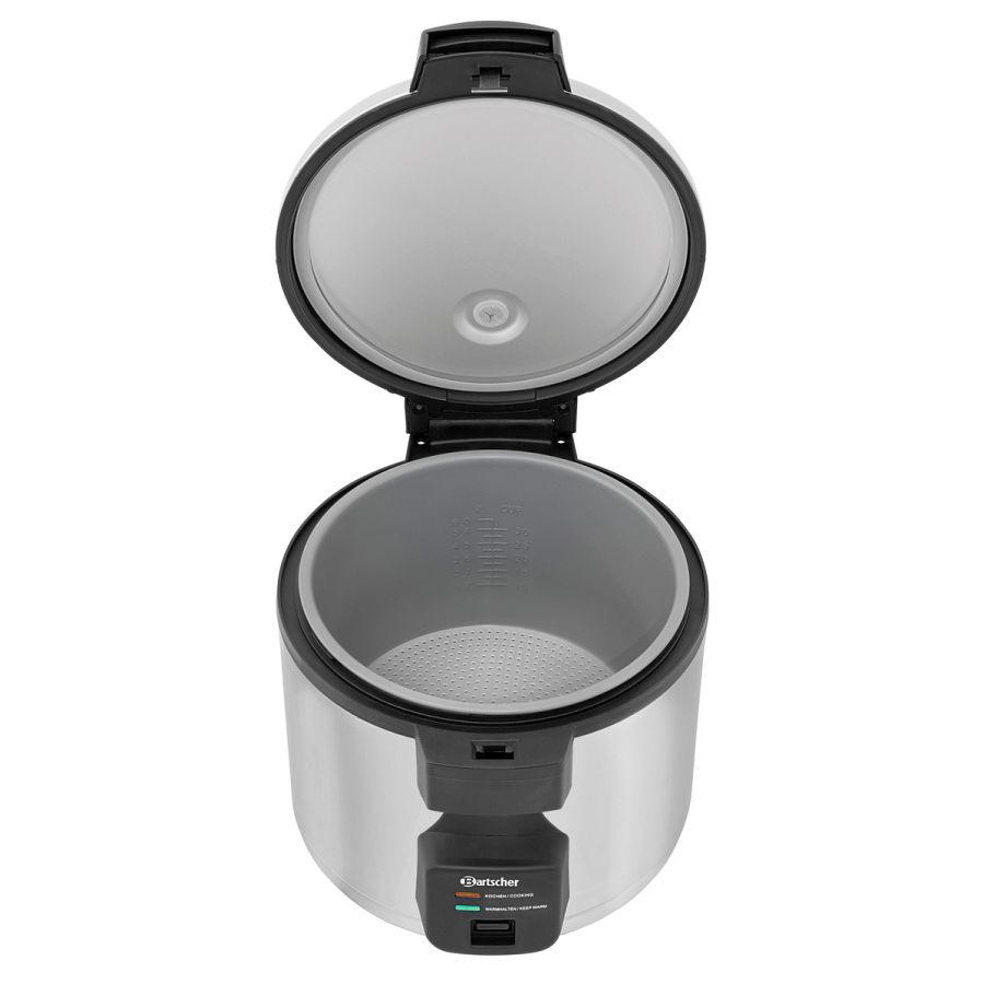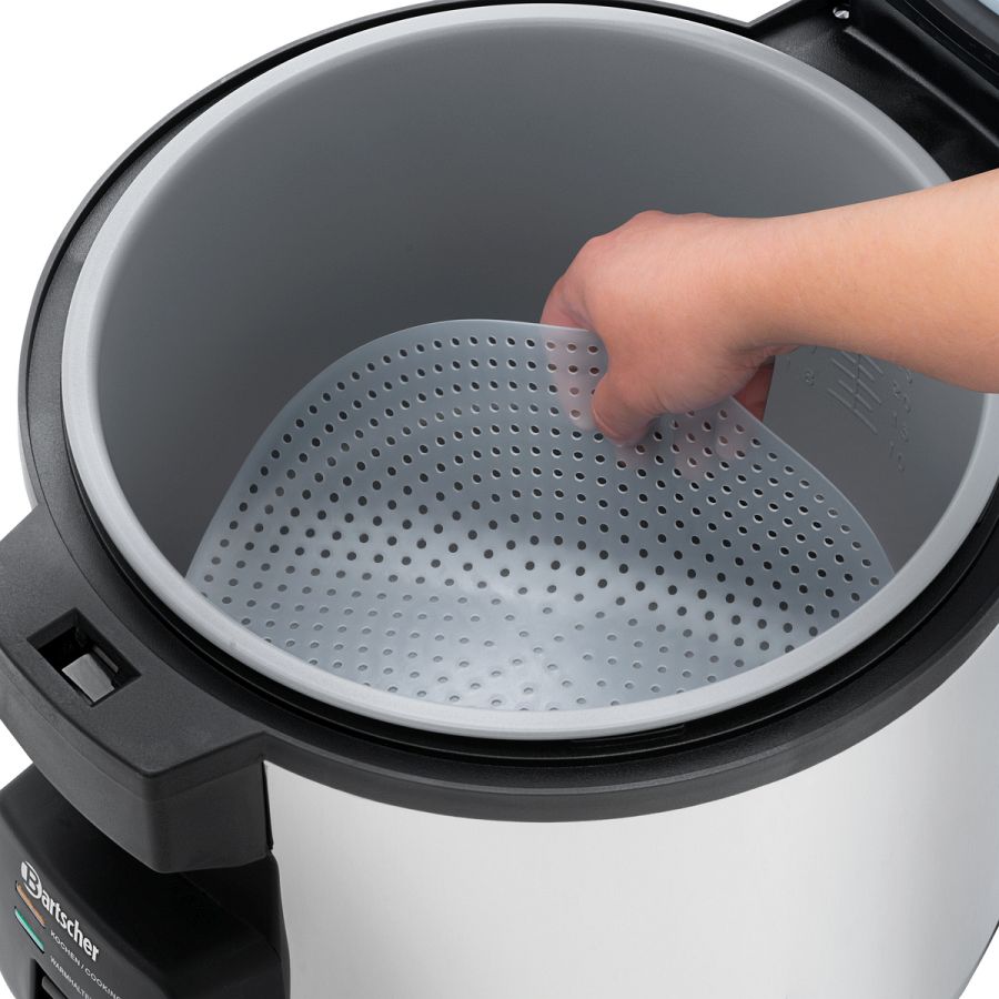 Perfekt gegarten Reis kochen und warmhalten für bis zu 40 Portionen mit dem Reiskocher 8 L. Mit der beiliegenden Silikonmatte wird das Anbrennen im Innentopf verhindert und erleichtert die Reinigung.