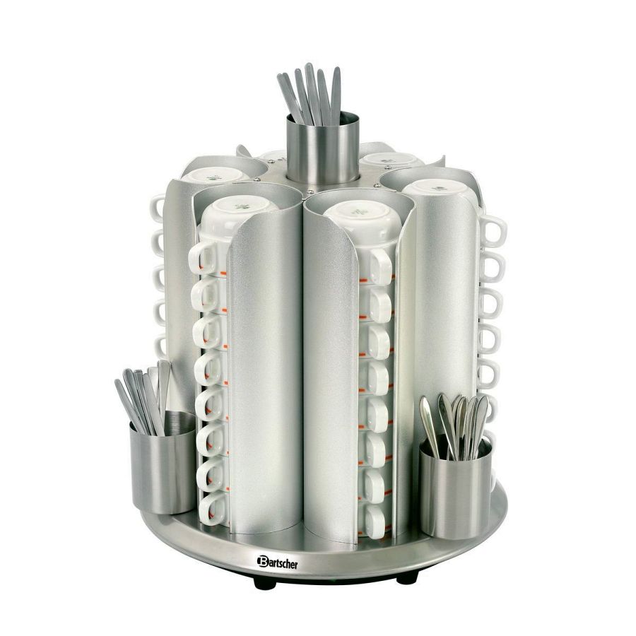 Kaffeetassen und Löffel sofort griffbereit. In dem Tassenwärmer mit praktischem drehbaren Sockel können bis zu 48 Kaffeetassen gleichzeitig vorgewärmt werden.