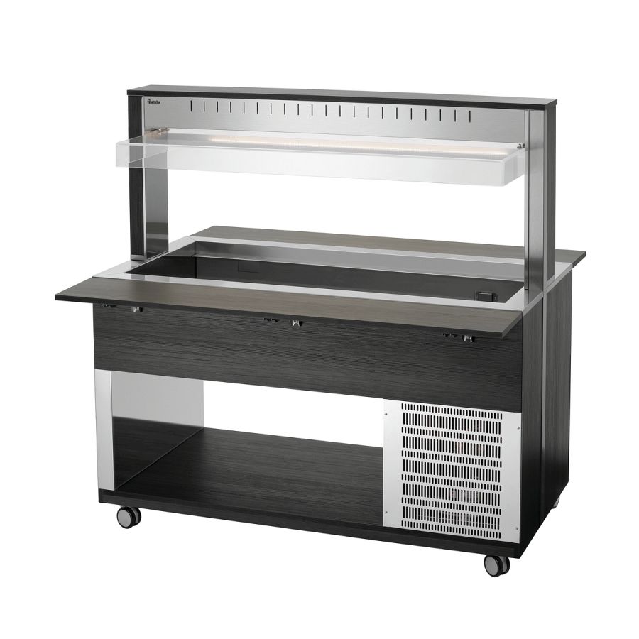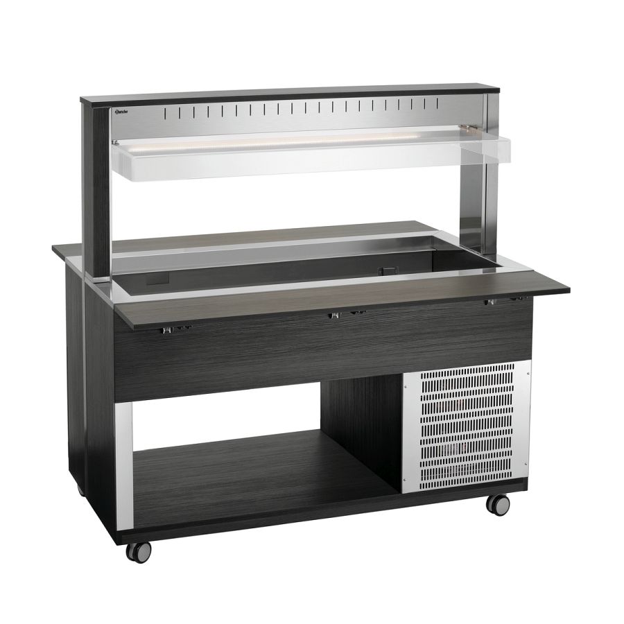 Die mobile Buffetlösung im modernen Holzdesign - Der Buffetwagen mit Hustenschutz und LED-Beleuchtung fasst 4 GN-Behälter 1/1 GN und hält Speisen zuverlässig am Buffet kalt.